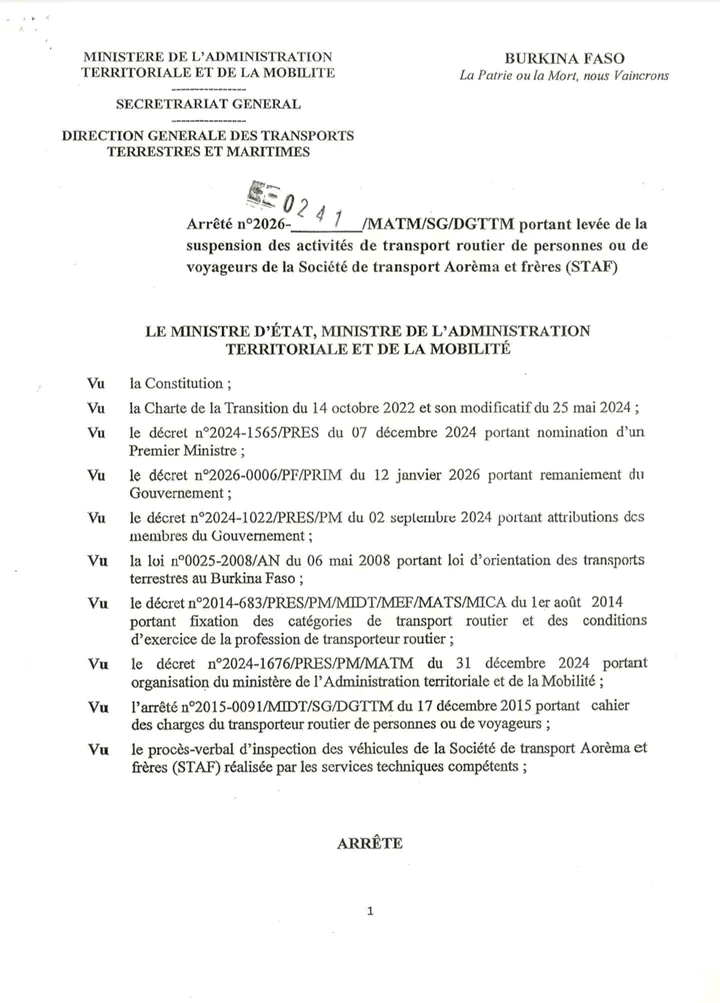 Arrêté portant levée de la suspension des activités de transport routier de personnes ou...