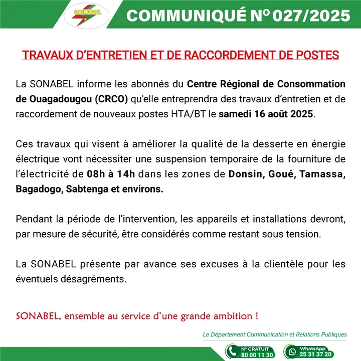🚨TRAVAUX D’ENTRETIEN ET DE RACCORDEMENT DE POSTES La SONABEL informe les abonnés du Centre...