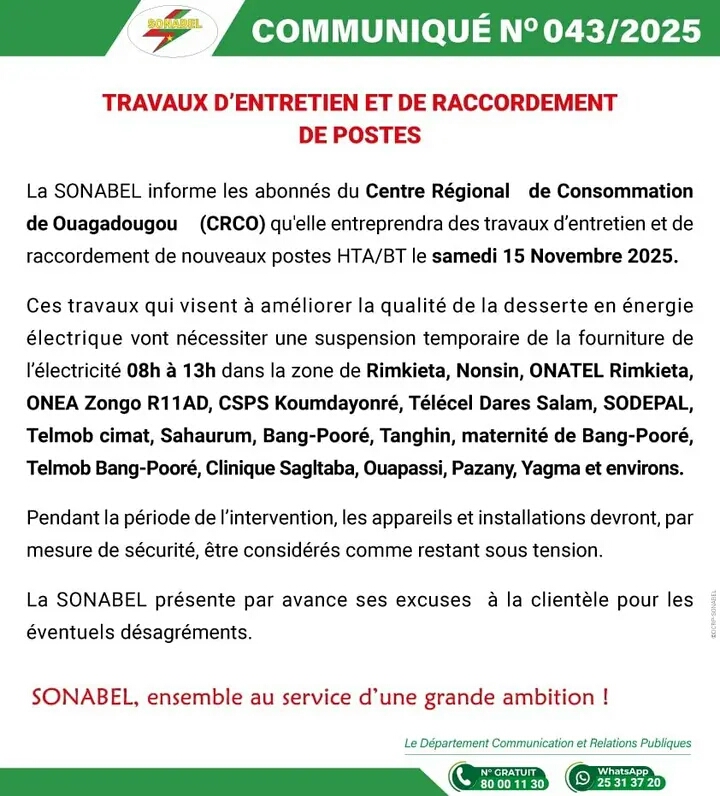 Le Directeur Général de la Société Nationale d’Électricité du Burkina (SONABEL) communique : Il...