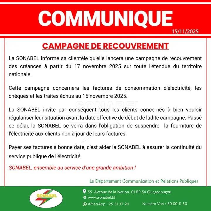 CAMPAGNE DE RECOUVREMENT La SONABEL informe sa clientèle qu’elle lancera une campagne de recouvrement...