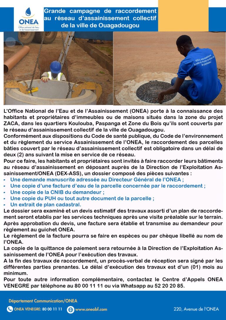 L’Office National de l’Eau et de l’Assainissement (ONEA) porte à la connaissance des habitants...