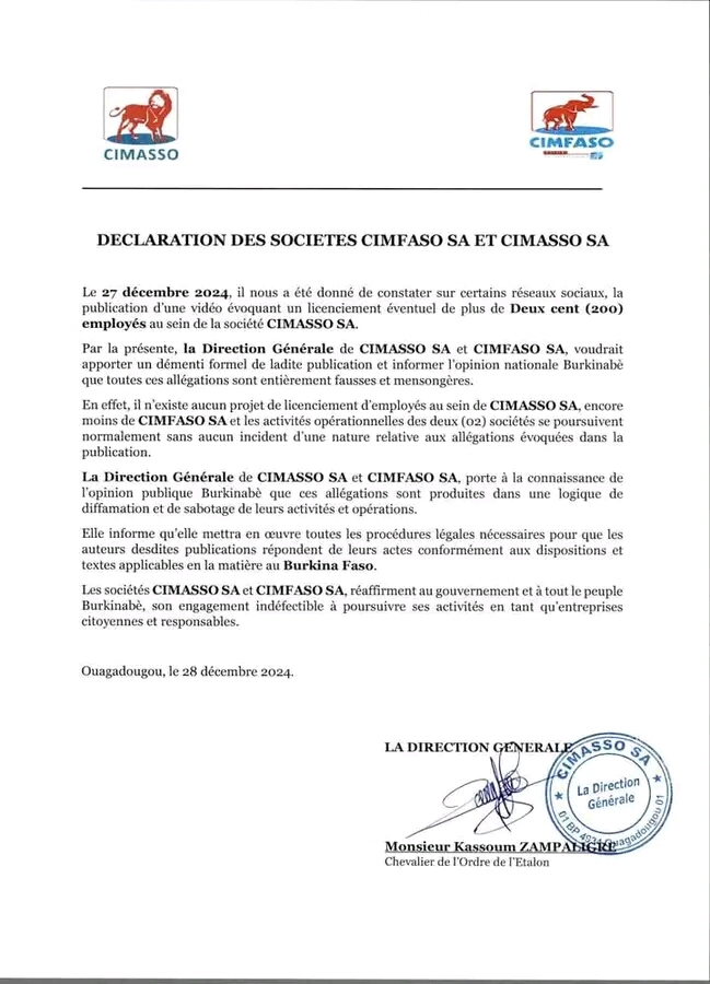 Ceci est un démenti de la Direction générale de CIMASSO et CIMFASO SA sur...