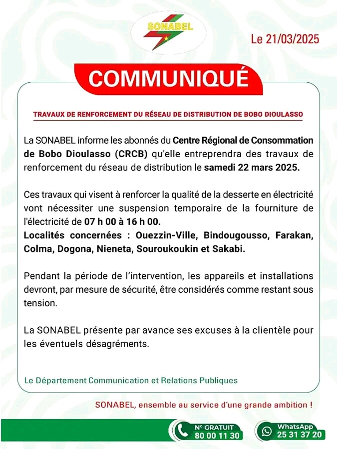 TRAVAUX DE RENFORCEMENT DU RÉSEAU DE DISTRIBUTION DE BOBO DIOULASSO La SONABEL informe les...