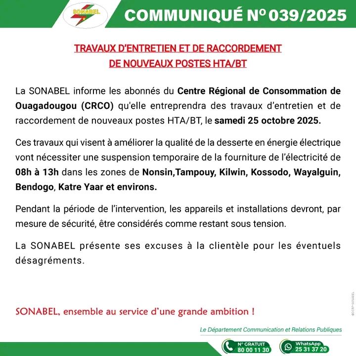 TRAVAUX D’ENTRETIEN ET DE RACCORDEMENT DE NOUVEAUX POSTES HTA/BT La SONABEL informe les abonnés...