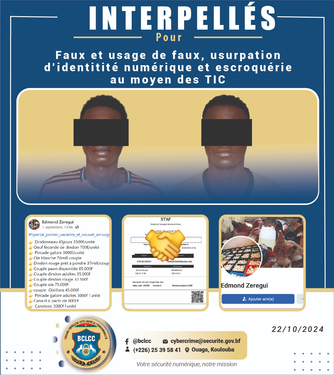 Leur mode opératoire consistait à créer des faux profils sur les réseaux sociaux, notamment sur Facebook, sous des pseudonymes tels que Edmond ZEREGUI, NIAMPA Moussa Souleymane, Plan Bizi, Asseta Houa, Reine ODG, et Faso book élevage. Ces faux comptes publiaient des annonces très attrayantes proposant des animaux de différentes races à des prix défiant toute concurrence. Une fois une victime appâtée par une annonce, elle était redirigée vers une conversation sur WhatsApp pour poursuivre les échanges.
