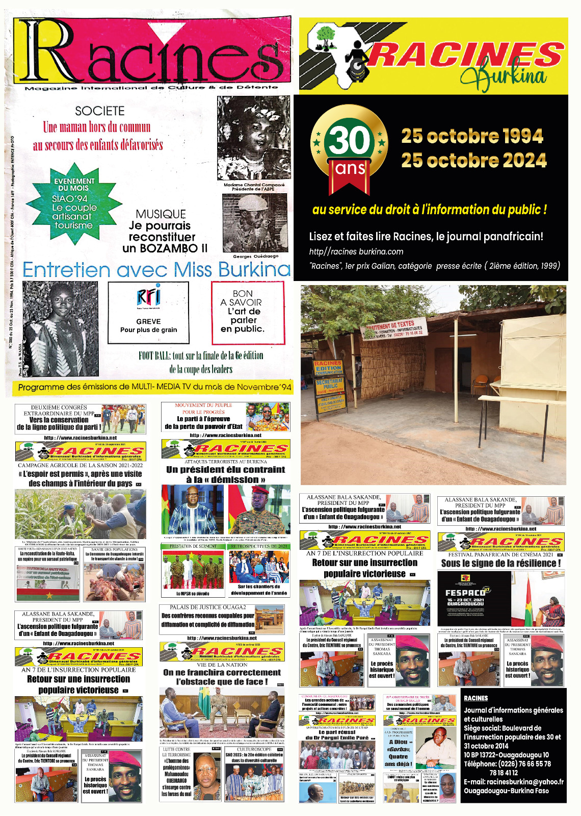 Trente ans après, c’est l’occasion ici, de rendre un hommage appuyé aux pères fondateurs du journal et à tous ceux qui ont cru au projet. En cette date d’anniversaire, la rédaction adresse une Mention spéciale également à tous les confrères qui ont collaboré avec ce journal à travers des contributions pertinentes depuis plusieurs années qui ont valu à Racines dès ses premières années de parution, le premier prix «Galian» (Catégorie presse écrite) à la deuxième édition des prix aux professionnels de la communication de 1999. Comment ne pas citer le plus célèbre des journalistes Burkinabè, l’intrépide combattant de la liberté de la presse et d’expression, Norbert ZONGO alias «Henri SEBGO Vrai», collaborateur des premières heures de Racines, éclaireur de conscience et de générations, HS est tombé avec les siens sous des balles assassines des prédateurs cagoulés de la liberté de la presse. Le 13 décembre 1998. Au fil du temps et au regard des mutations socio politique que connait le pays, le journal connait une mue, tout en s’adaptant. Il a su surnager et résister à toutes les tempêtes politiques et résister à toutes les crises économiques qu’a connues notre pays. Des nombreux titres de presse des années 90 à nos jours, beaucoup ont mis la clé sous le paillasson, pour ne pas dire qu’ils ont complètement disparu. Ce qui n’est pas le cas de Racines. On pourra lui imputer des parutions sporadiques, mais dans un contexte de sécheresse économique aiguë, c’est le sort réservé à bon nombre de titres de la presse privée. Mais au moins, il a eu le mérite de na ne pas disparaitre complètement du paysage médiatique national. Les lecteurs assidus de Racines auront remarqué que le traitement de l’actualité politique a pris le dessus sur le volet culturel, sans pour autant l’occulter totalement. Dans un contexte de bouillonnement politique qu’a connu le Burkina durant la dernière décennie (insurrection populaire de 2014, première transition politique, coup d’Etat manqué de 2015, avènement du MPP au pouvoir….), le journal ne pouvait rester en marge de cette période tumultueuse de la vie politique au Burkina Faso. Et à l’heure ou le pays est confronté à une guerre injuste qu’on lui a imposée à travers le terrorisme, Racines entend poursuivre sa mission de diffusion d’une information de qualité.Et cela au service de la libération totale de notre territoire, pour être en phase avec la vision des plus hautes autorités du pays. Dans un contexte économique difficile, marqué par la crise de la disponibilité du journal papier importé, Racines se voit contraint de paraitre en ligne à l’adresse: (http//wwwracinesburkina.com). Cette mutation a pour avantage d’avoir une plus grande disponibilité de l’information auprès des lecteurs, qui n’avaient pas accès au journal physique. A travers ce changement de support de diffusion, Racines se veut être un média résilient, à l’image du Burkina, pour porter le combat sur le plan médiatique pour la reconquête du territoire national. A l’occasion de son trentième anniversaire, Racines voudrait rendre aussi hommage, à toutes les Forces combattantes déployées sur le théâtre des opérations pour la victoire finale. Racines émet avec force le vœu qu’à son prochain anniversaire, le terrorisme soit bouté complètement hors du Burkina Faso, la terre des Hommes intègres. Encore une fois de plus comme nous l’avons toujours écrit depuis des décennies d’existence, nous ne roulons pour personne, sauf sur la base de nos propres convictions, pour l’information constructive, la vérité et les faits. Racines Burkina est un journal de journalistes. Nous nous efforcerons comme toujours tant que nous aurons toujours la force d’exister, de relater à travers nos colonnes ce qui mérite d’être porté à la connaissance du public.
