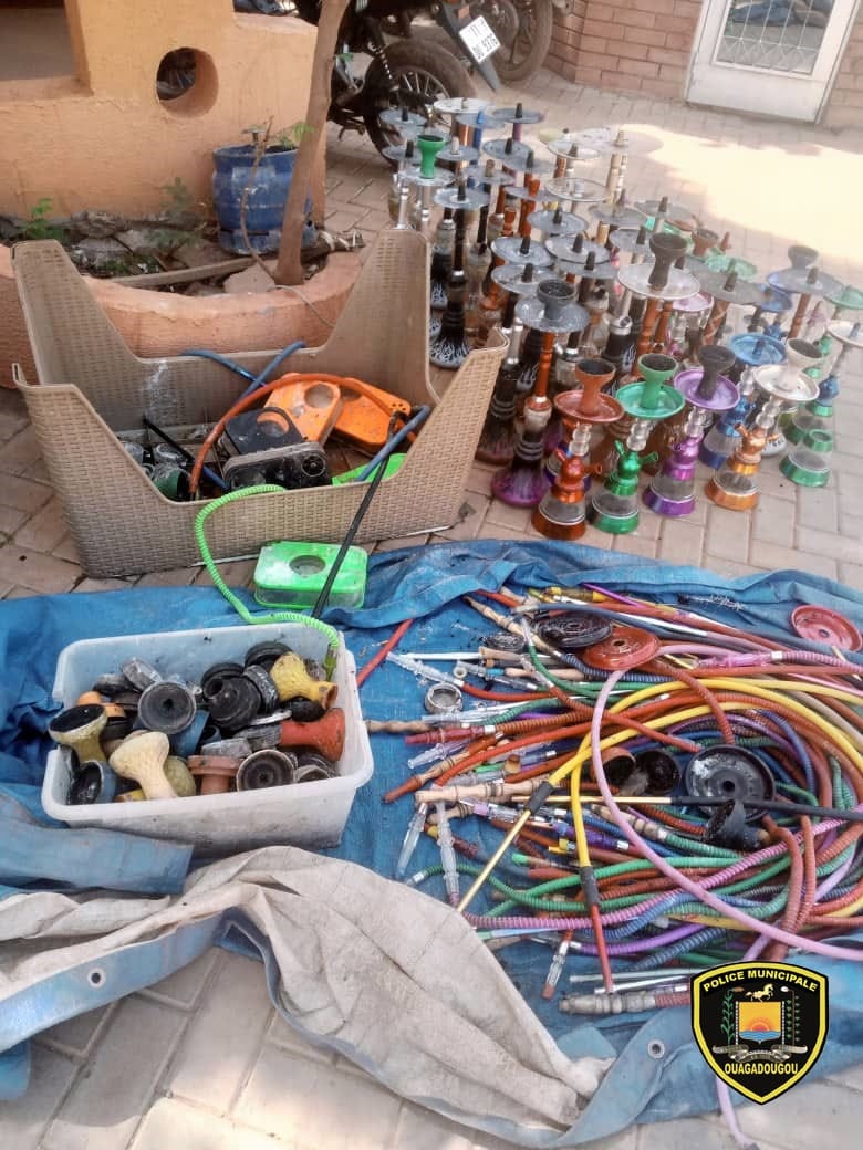 Lors du contrôle, plusieurs autres infractions liées aux conditions d’exploitation d’un débit de boissons ont été constatées. En application de l’arrêté portant interdiction de la consommation de la Chicha dans la ville de Ouagadougou, Une importante quantité de chicha (52 tubes et une bouteille de gaz) a été saisie dans le bar.