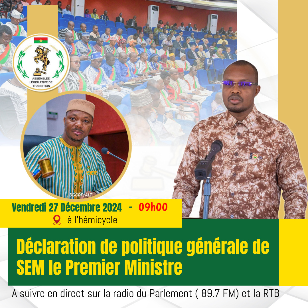 A la une Actualité DPG du Premier ministre ce 27 décembre Réveil info 26 décembre 2024 A partir de 9 h sur la RTB Continue Reading Previous Previous post: Le premier ministre, Rimtalba Jean Emmanuel Ouédraogo devant les députés ce 27 décembre 2024 pour sa Déclaration de politique générale (DPG)Next Next post: Dernier Conseil des ministres de l’année 2024 ce 26 décembre … Laisser un commentaire Annuler la réponseVotre adresse e-mail ne sera pas publiée. Les champs obligatoires sont indiqués avec *Commentaire * Nom * E-mail * Site web Enregistrer mon nom, mon e-mail et mon site dans le navigateur pour mon prochain commentaire. Articles connexes Contrat d’objectifs : le premier ministre Rimtalba dresse un bilan global satisfaisant 3 février 2026 Contrat d’objectifs : 98,41% pour le MCCAT 3 février 2026
