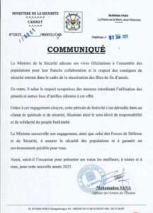 Grâce à cet engagement citoyen, cette période de festivité s’est déroulée dans un climat de quiétude et de sécurité, illustrant ainsi le sens élevé de responsabilité et de solidarité du peuple burkinabè.