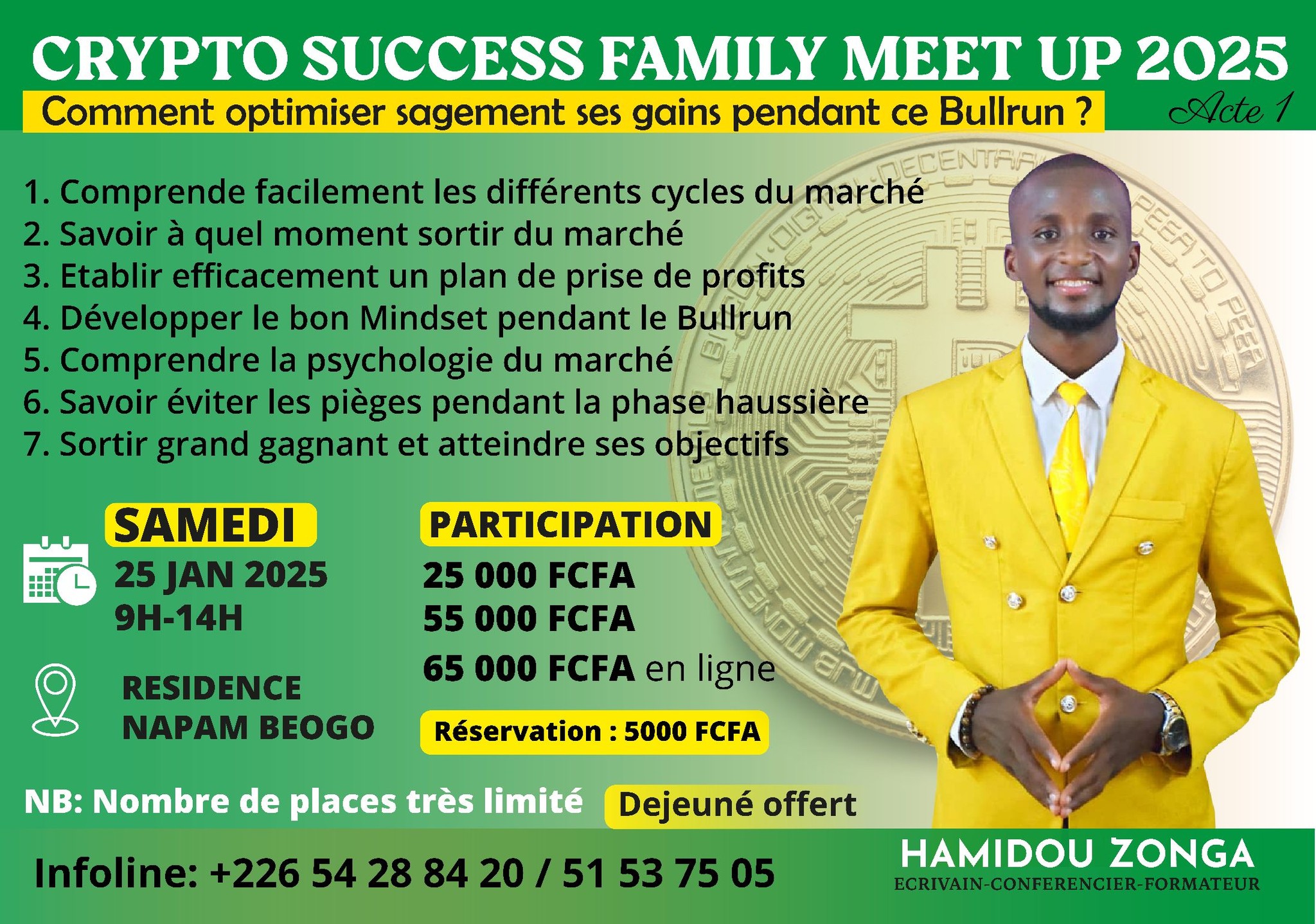 À cet effet, nous vous donnons rendez-vous le samedi 25 JANVIER 2025, À LA RÉSIDENCE NAPAM BEOGO, À OUAGADOUGOU, pour une FORMATION SPÉCIALE SUR LES STRATÉGIES DE PRISE DE PROFITS POUR SORTIR GRAND GAGNANT PENDANT CE CYCLE HAUSSIER DES CRYPTOMONNAIES.