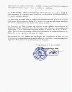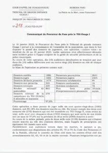 Annonces-Communiqués Communiqué du Procureur du Faso TGI Ouaga 1 Réveil info 1 février 2025 Continue Reading Previous Previous post: Déguerpissement à Karpala: un commerçant sort son arme…Next Next post: Retrait de l’AES de la CEDEAO: les fortes convictions de Adama Siguiré Laisser un commentaire Annuler la réponseVotre adresse e-mail ne sera pas publiée. Les champs obligatoires sont indiqués avec *Commentaire * Nom * E-mail * Site web Enregistrer mon nom, mon e-mail et mon site dans le navigateur pour mon prochain commentaire. Articles connexes Annonce-ECO-BF: pour vos sacs et emballages biodégradables 30 janvier 2026 Conseil des ministres : dissolution des partis et formations politiques 29 janvier 2026