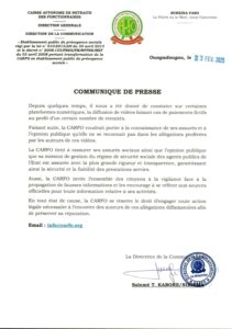 Actualité Annonces-Communiqués Communiqué: la CARFO n’est pas dans çà!!! Réveil info 3 février 2025 Continue Reading Previous Previous post: Semaine de la Fraternité de l’AES: le ministre Gilbert P. Ouédraogo au MaliNext Next post: Carnet du Baladeur – Libre circulation des personnes et des biens dans l’espace AES : du plomb dans l’aile sur le trajet Ouaga-Bamako Laisser un commentaire Annuler la réponseVotre adresse e-mail ne sera pas publiée. Les champs obligatoires sont indiqués avec *Commentaire * Nom * E-mail * Site web Enregistrer mon nom, mon e-mail et mon site dans le navigateur pour mon prochain commentaire. Articles connexes Conseil des ministres ce 5 février 2026 5 février 2026 Niger : Nathalie Yamb devient conseillère du président Tiani et reçoit un passeport diplomatique 5 février 2026