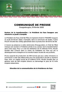 Le Président du Faso, Chef de l’État, le Capitaine Ibrahim TRAORÉ inaugure ce jeudi 20 février 2025 à Gampèla, dans la commune de Saaba, l’usine Moulin Double Star (M2S), spécialisée dans la production de farine de blé.