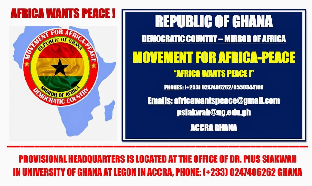 Nous avons respectueusement l’honneur, de vous informer de ce qui suit : Nous attestons par la présente la création du Mouvement dénommé : « MOUVEMENT POUR LA PAIX EN AFRIQUE ». Son Bureau Exécutif est composé de cinquante-quatre (54) nationalités issues de pays africains, dont l’objectif est de préserver la Paix, condition sine qua non, du Développement, par tous les moyens en Afrique, conformément à l’Objectif 16, ODD-16, relatif aux Objectifs de Développement Durable des Nations Unies : 17 ODD. L’Objectif 16 vise à promouvoir des sociétés pacifiques et inclusives, à assurer l’accès à la justice pour tous et à mettre en place des institutions efficaces, responsables et inclusives à tous les niveaux. Les gens partout dans le monde devraient être à l’abri de la crainte de toutes les formes de violence et se sentir en sécurité dans la poursuite de leurs activités quelle que soit leur appartenance ethnique, leur foi ou leur orientation sexuelle. Site Web : https://www.un.org/sustainabledevelopment/peace-justice/ . Le siège provisoire est situé au Cabinet du Docteur Pius SIAKWAH, à l’Université du Ghana à Legon à Accra. Nous demandons à toutes les Personnes de bonne volonté, Organisations Non Gouvernementales : ONG, Fondations privées, ou toutes Institutions étatiques, d’apporter leur concours, tant moral, matériel que financier, au Mouvement susnommé : « MOUVEMENT POUR LA PAIX EN AFRIQUE » afin de permettre à cette ONG d’atteindre ses Objectifs. Dans l’attente de vous rencontrer, veuillez agréer l’expression de notre haute considération.