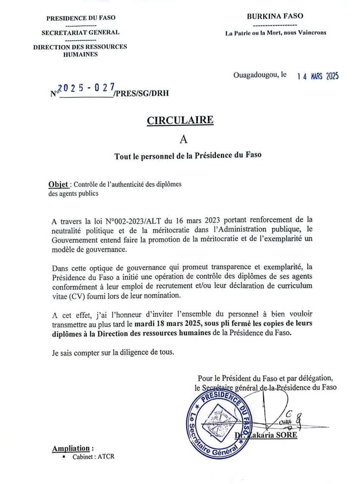 Actualité Présidence du Faso: contrôle de l’authenticité des diplômes des agents publics ( Circulaire ) Réveil info 17 mars 2025 Continue Reading Previous Previous post: FESPACO 2025 : Les lauréats burkinabè chez le Ministre Pingdwendé Gilbert OUEDRAOGONext Next post: RCI : l’opposition «veut mettre en cause» l’élection (officiel) Laisser un commentaire Annuler la réponseVotre adresse e-mail ne sera pas publiée. Les champs obligatoires sont indiqués avec *Commentaire * Nom * E-mail * Site web Enregistrer mon nom, mon e-mail et mon site dans le navigateur pour mon prochain commentaire. Articles connexes Fonction publique Mali: 43000 candidats pour 824 places 2 février 2026 Les USA et l’AES: revirement 2 février 2026