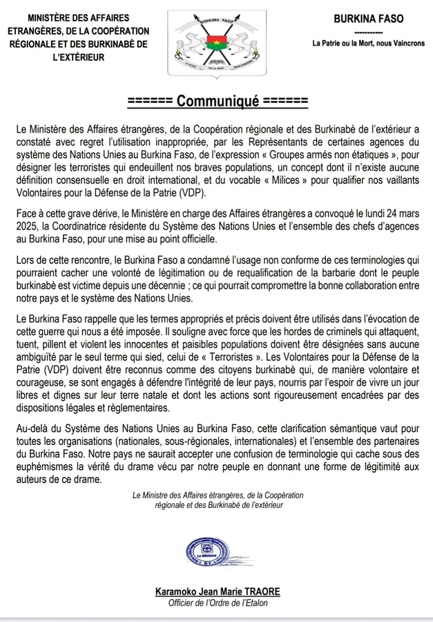 Annonces-Communiqués Communiqué : Clarification sémantique du Ministère des Affaires étrangères, de la Coopération régionale et des Burkinabè de l’extérieur Réveil info 25 mars 2025 Continue Reading Previous Previous post: Héritage spirituel des forgerons: le Koudougou ou l’autel de la forgeNext Next post: Sénégal : le FMI révèle une dette cachée de 7 milliards de dollars sous Macky Sall Laisser un commentaire Annuler la réponseVotre adresse e-mail ne sera pas publiée. Les champs obligatoires sont indiqués avec *Commentaire * Nom * E-mail * Site web Enregistrer mon nom, mon e-mail et mon site dans le navigateur pour mon prochain commentaire. Articles connexes Annonce-ECO-BF: pour vos sacs et emballages biodégradables 30 janvier 2026 Conseil des ministres : dissolution des partis et formations politiques 29 janvier 2026