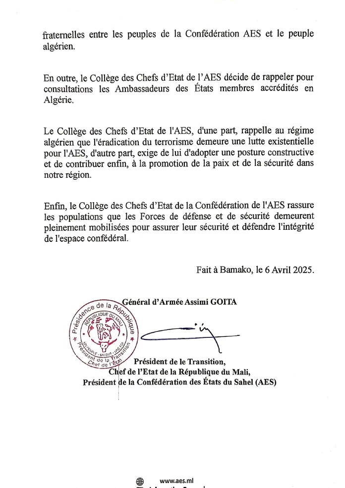 Actualité Annonces-Communiqués Communiqué du collège des Chefs d’État de la Confédération des États du Sahel ( AES) Réveil info 6 avril 2025 Continue Reading Previous Previous post: Communauté AES en Russie: Dialogue direct avec les ministres des Affaires étrangères de I’AESNext Next post: Lutte contre le granditisme à Réo: 4 présumés auteurs de vol dans les filets de gendarmerie nationale Laisser un commentaire Annuler la réponseVotre adresse e-mail ne sera pas publiée. Les champs obligatoires sont indiqués avec *Commentaire * Nom * E-mail * Site web Enregistrer mon nom, mon e-mail et mon site dans le navigateur pour mon prochain commentaire. Articles connexes Côte d’Ivoire : une journaliste pose plainte contre l’international footballeur Yaya Touré et veut 50 millions 1 février 2026 Coutumes et traditions : le repas communautaires. 1 février 2026