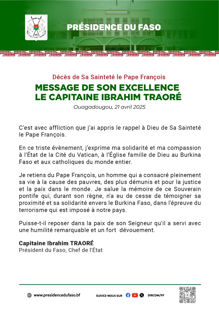 Actualité Coutume et religion Décès du Pape François : le message du Président du Faso Réveil info 21 avril 2025 Continue Reading Previous Previous post: Urgent Burkina : A tout directeur regional de l’enseignement secondaire de la formation professionnelle et techniqueNext Next post: Vatican- décès du pape:le processus de désignation d’un nouveau Pape Laisser un commentaire Annuler la réponseVotre adresse e-mail ne sera pas publiée. Les champs obligatoires sont indiqués avec *Commentaire * Nom * E-mail * Site web Enregistrer mon nom, mon e-mail et mon site dans le navigateur pour mon prochain commentaire. Articles connexes Nigeria : les soldats Américains sont arrivés 4 février 2026 Nigeria : les USA envoient des troupes 4 février 2026