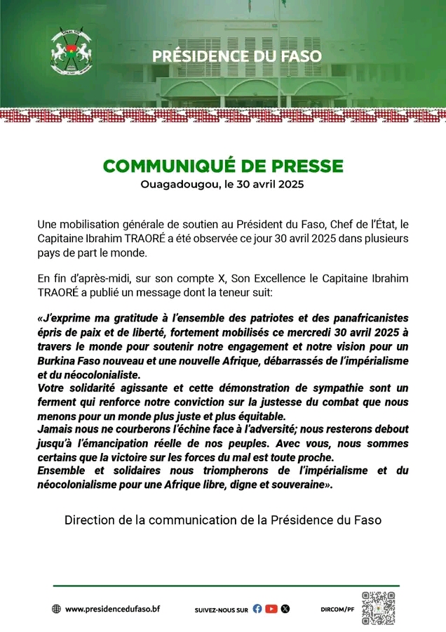 Actualité Soutien mondial au président du Faso: la réaction du capitaine Ibrahim Traoré Réveil info 30 avril 2025 Continue Reading Previous Previous post: Remerciements et faire-part: Famille ZOMBRE et SAWADOGONext Next post: Burkina: des enfants sauvés des griffes du GSIM racontent leur calvaire Laisser un commentaire Annuler la réponseVotre adresse e-mail ne sera pas publiée. Les champs obligatoires sont indiqués avec *Commentaire * Nom * E-mail * Site web Enregistrer mon nom, mon e-mail et mon site dans le navigateur pour mon prochain commentaire. Articles connexes JOURNÉE MONDIALE DU TRAVAIL SOCIAL: DÉCLARATION DE MADAME LE MINISTRE DE LA FAMILLE ET DE LA SOLIDARITÉ 17 mars 2026 Loi sur la chefferie coutumière et traditionnelle : Razān-Naaba BelemWendé de Boudri parle sans détour 17 mars 2026