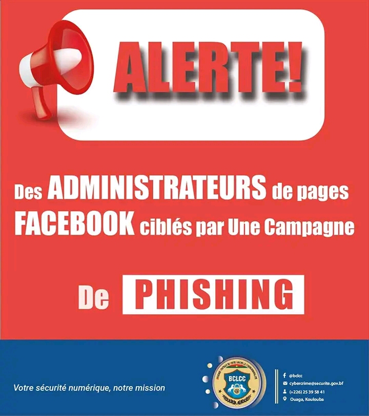 Depuis quelque temps, la Brigade Centrale de Lutte Contre la Cybercriminalité (BCLCC), à travers son service de veille technologique et d’assistance technique, a constaté une campagne de phishing (hameçonnage) visant principalement les administrateurs de pages Facebook de structures publiques, privées, ainsi que celles de personnalités publiques.