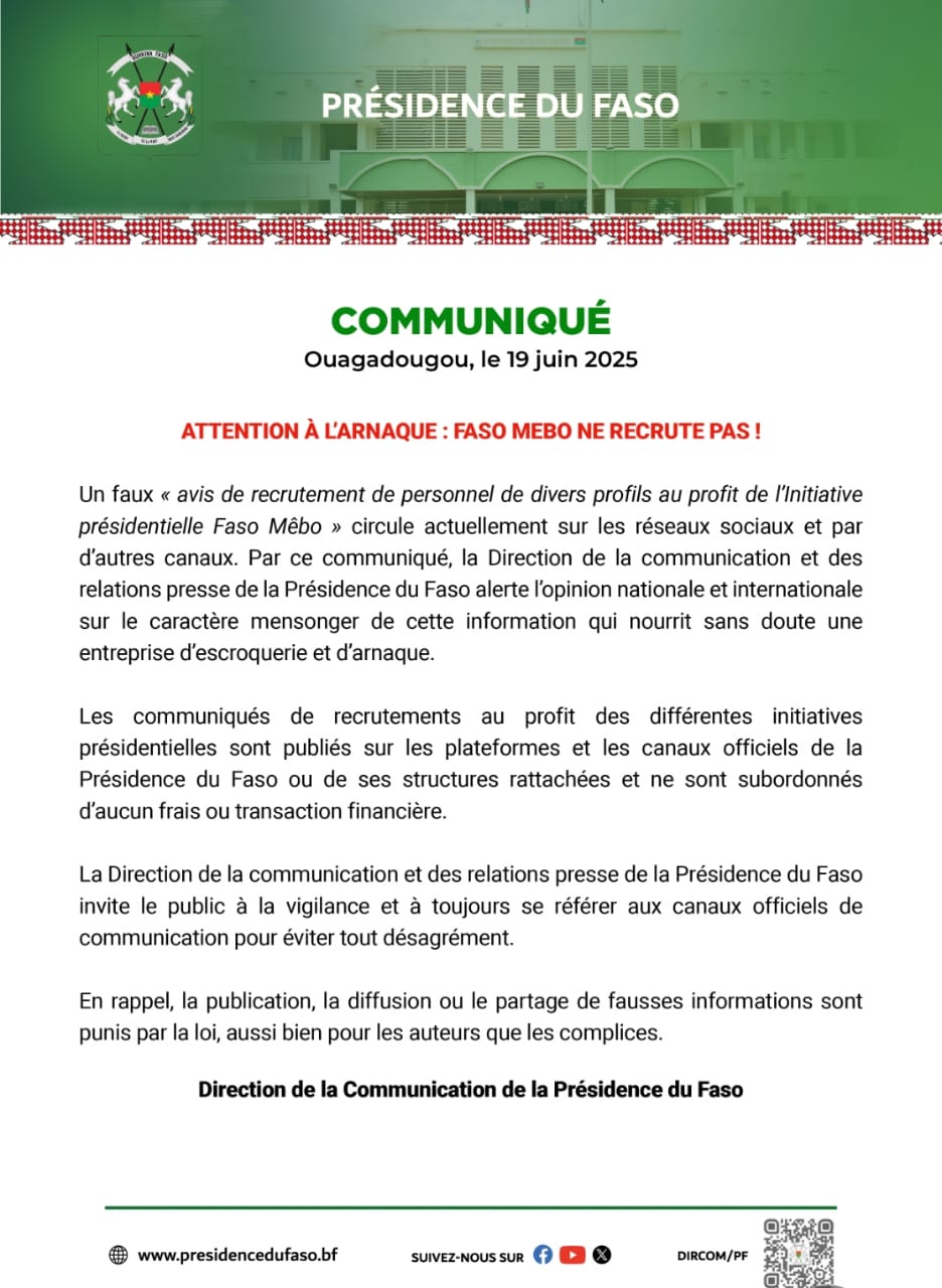Actualité Annonces-Communiqués Attention à l’anarque: Faso Mêbo ne recrute pas!!!! ( communiqué) Réveil info 19 juin 2025 Continue Reading Previous Previous post: Inde :Un milliardaire meurt après avoir été piqué par une abeilleNext Next post: Au palais de justice: un homme et sa dulcinée jugés pour avoir eu des rapports sexuels dans un champs… Laisser un commentaire Annuler la réponseVotre adresse e-mail ne sera pas publiée. Les champs obligatoires sont indiqués avec *Commentaire * Nom * E-mail * Site web Enregistrer mon nom, mon e-mail et mon site dans le navigateur pour mon prochain commentaire. Articles connexes Les USA et l’AES: revirement 2 février 2026 Maillage du territoire : le président IB remet 2000 motos à la Police nationale 2 février 2026