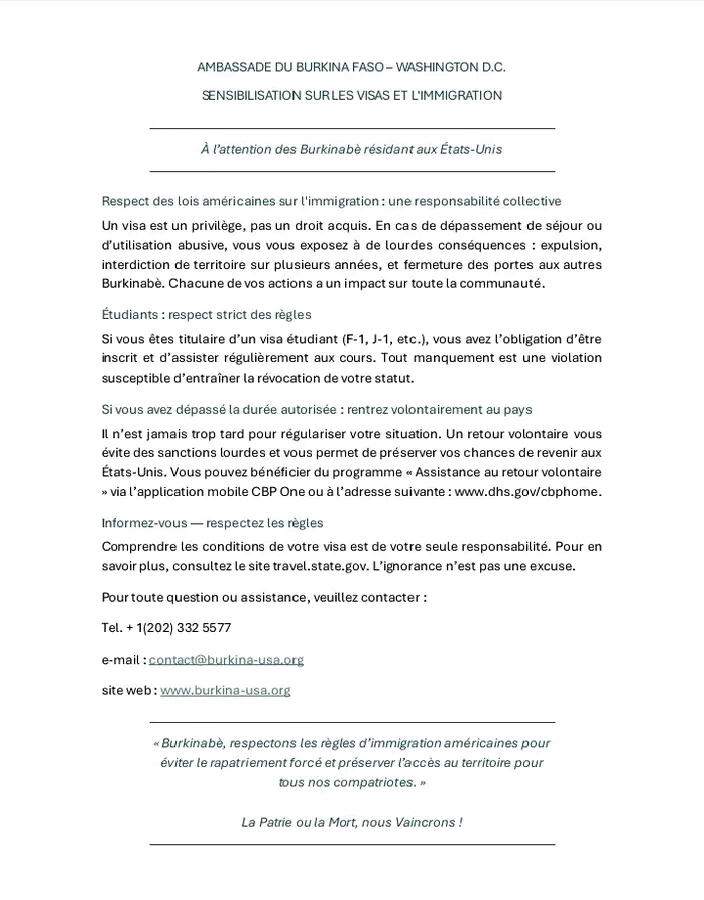 Actualité Annonces-Communiqués Affaire visas Amercain: le communiqué de l’ambassade du Burkina Faso à Washington Réveil info 28 juin 2025 Communiqué de l’Ambassade du Burkina Faso à Washington D.C relatif aux Visas et l’immigration Continue Reading Previous Previous post: Région de l’Est : le premier ministre en séjour officielNext Next post: Présidentielle 2025 en Côte-d’Ivoire – Le candidat Jean-Louis Billon au presisent Ouattara: » tonton ton temps est passé » Laisser un commentaire Annuler la réponseVotre adresse e-mail ne sera pas publiée. Les champs obligatoires sont indiqués avec *Commentaire * Nom * E-mail * Site web Enregistrer mon nom, mon e-mail et mon site dans le navigateur pour mon prochain commentaire. Articles connexes Grand prix cycliste RTB: la RTB chez le Mogho Naaba 3 février 2026 Ghana : le Co-fondateur de Ecobank et la compagnie aérienne Asky honoré 3 février 2026