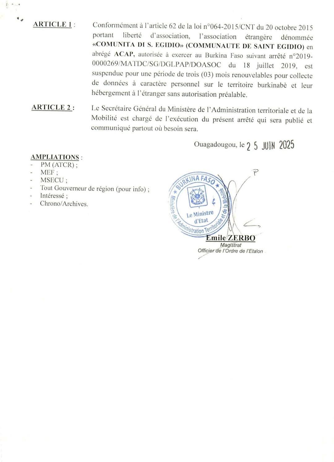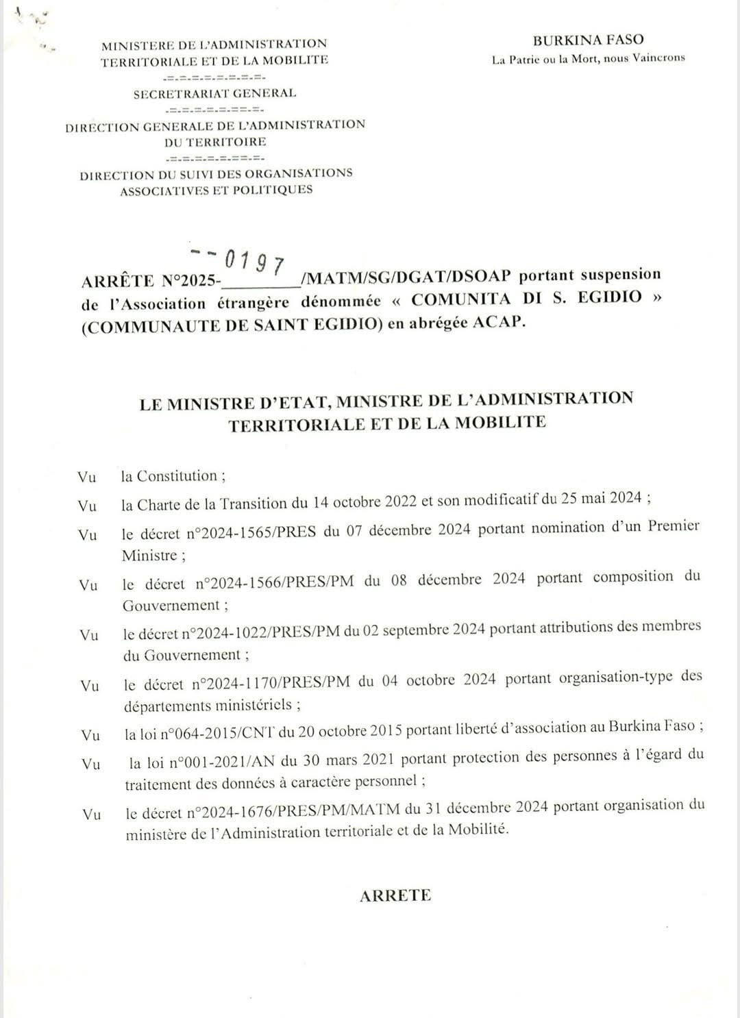 Annonces-Communiqués Burkina: Arrêté portant suspension de l’Association étrangère dénommée « COMUNITA DI S. EGIDIO » (COMMUNAUTE DE SAINT EGIDIO) en abrégée ACAP Réveil info 30 juin 2025 Arrêté portant suspension de l’Association étrangère dénommée « COMUNITA DI S. EGIDIO » (COMMUNAUTE DE SAINT EGIDIO) en abrégée ACAP. Continue Reading Previous Previous post: Burkina- Guinée-Bissau: renforcement de la coopération en matière de protection socialeNext Next post: ASCE-LC: le rapport 2023 dans les mains du Premier ministre Laisser un commentaire Annuler la réponseVotre adresse e-mail ne sera pas publiée. Les champs obligatoires sont indiqués avec *Commentaire * Nom * E-mail * Site web Enregistrer mon nom, mon e-mail et mon site dans le navigateur pour mon prochain commentaire. Articles connexes FASO MEBO- Bilan contributions par région : plus de 45 millions pour le Kadiogo 1 février 2026 Dissolution des partis politiques : Réaction de l’ex -CDP 31 janvier 2026