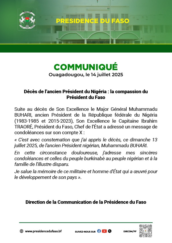 Actualité Annonces-Communiqués Décès de l’ancien président du Nigeria: la compassion du président du Faso Réveil info 14 juillet 2025 Continue Reading Previous Previous post: Concours de la Fonction publique 2025: pour 154 concours directs, plus de 2 millions de candidaturesNext Next post: Notions juridiques: quelle est la différence entre loi,décret et arrêté ? Laisser un commentaire Annuler la réponseVotre adresse e-mail ne sera pas publiée. Les champs obligatoires sont indiqués avec *Commentaire * Nom * E-mail * Site web Enregistrer mon nom, mon e-mail et mon site dans le navigateur pour mon prochain commentaire. Articles connexes Situation de la nation du Premier ministre Rimtalba : la synthèse du journaliste Tabyam Ouédraogo 30 janvier 2026 Niger- Côte d’Ivoire : les deux ambassadeurs respectifs convoqués par leur pays 30 janvier 2026