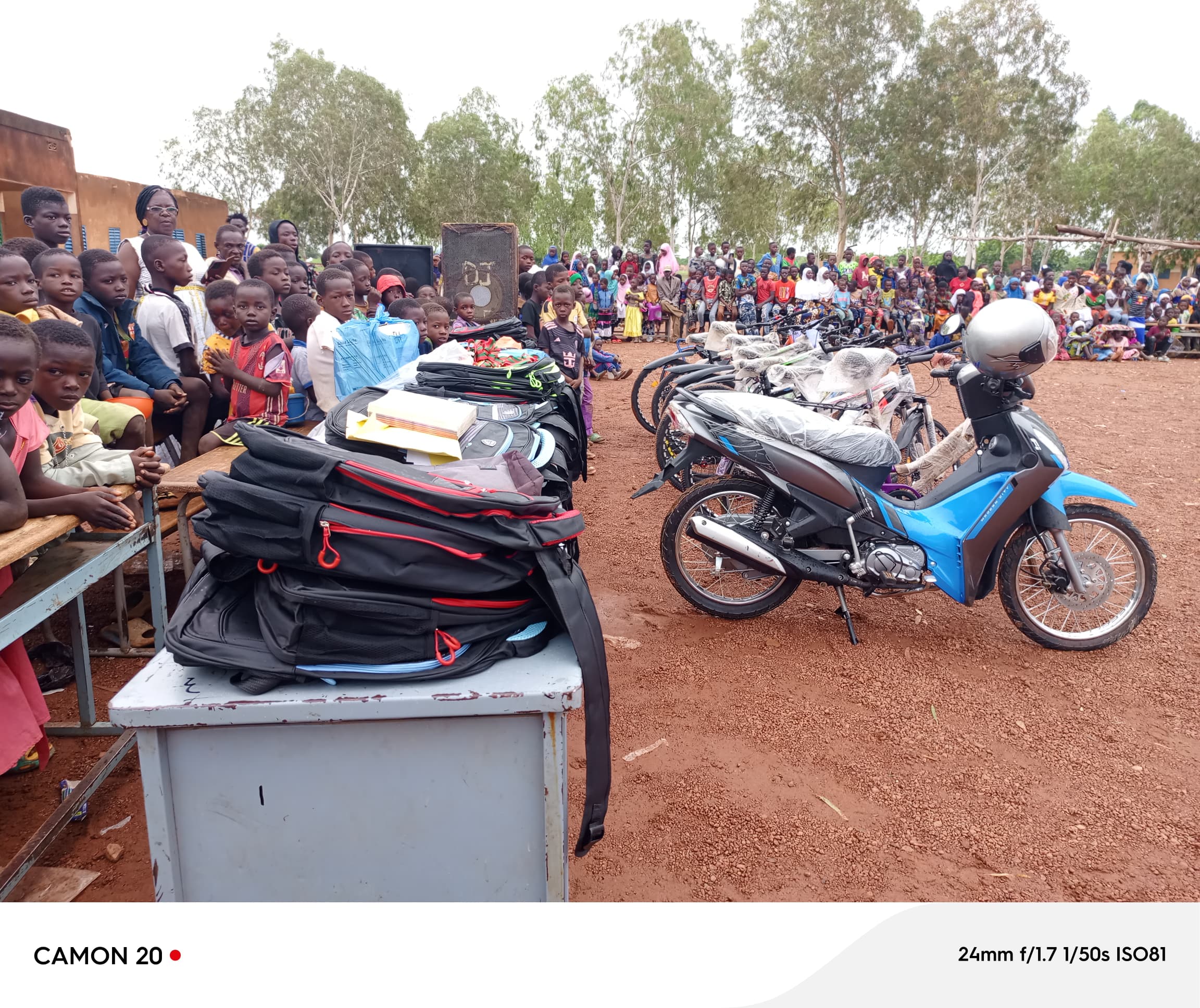 La reconnaissance s’est exprimée en dons concrets et utiles : tous les élèves admis au CEP de cette ont été primés par des démailles personnalisées à leur nom. Les 5 premiers de chaque classe (du CP1 au CM2), les filles et garçons classés premiers à l’examen ainsi que des déplacés internes admis à l’examen ont reçu des kits scolaires, vélos… Et une moto flambant neuve offerte à l’enseignante de CM2 de Kinkianly pour sa bravoure pédagogique.