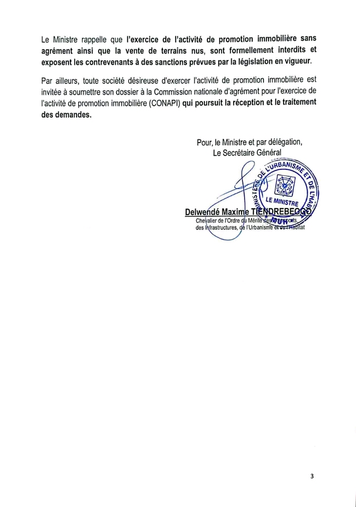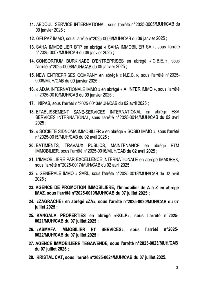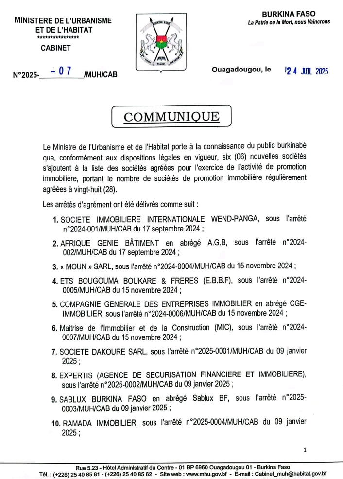 Annonces-Communiqués Liste actualisées des Sociétés immobilières agrées Réveil info 25 juillet 2025 Continue Reading Previous Previous post: Promesse de CIMFASO: le vieux a sa villa F3,du concret!Next Next post: Police nationale: un vaste réseau de malfaiteurs démantelé à Ouagadougou Laisser un commentaire Annuler la réponseVotre adresse e-mail ne sera pas publiée. Les champs obligatoires sont indiqués avec *Commentaire * Nom * E-mail * Site web Enregistrer mon nom, mon e-mail et mon site dans le navigateur pour mon prochain commentaire. Articles connexes Ramadan : Communiqué FAIB 19 mars 2026 Les grands dossiers du Conseil des ministres de ce jeudi 19 mars 2026 19 mars 2026