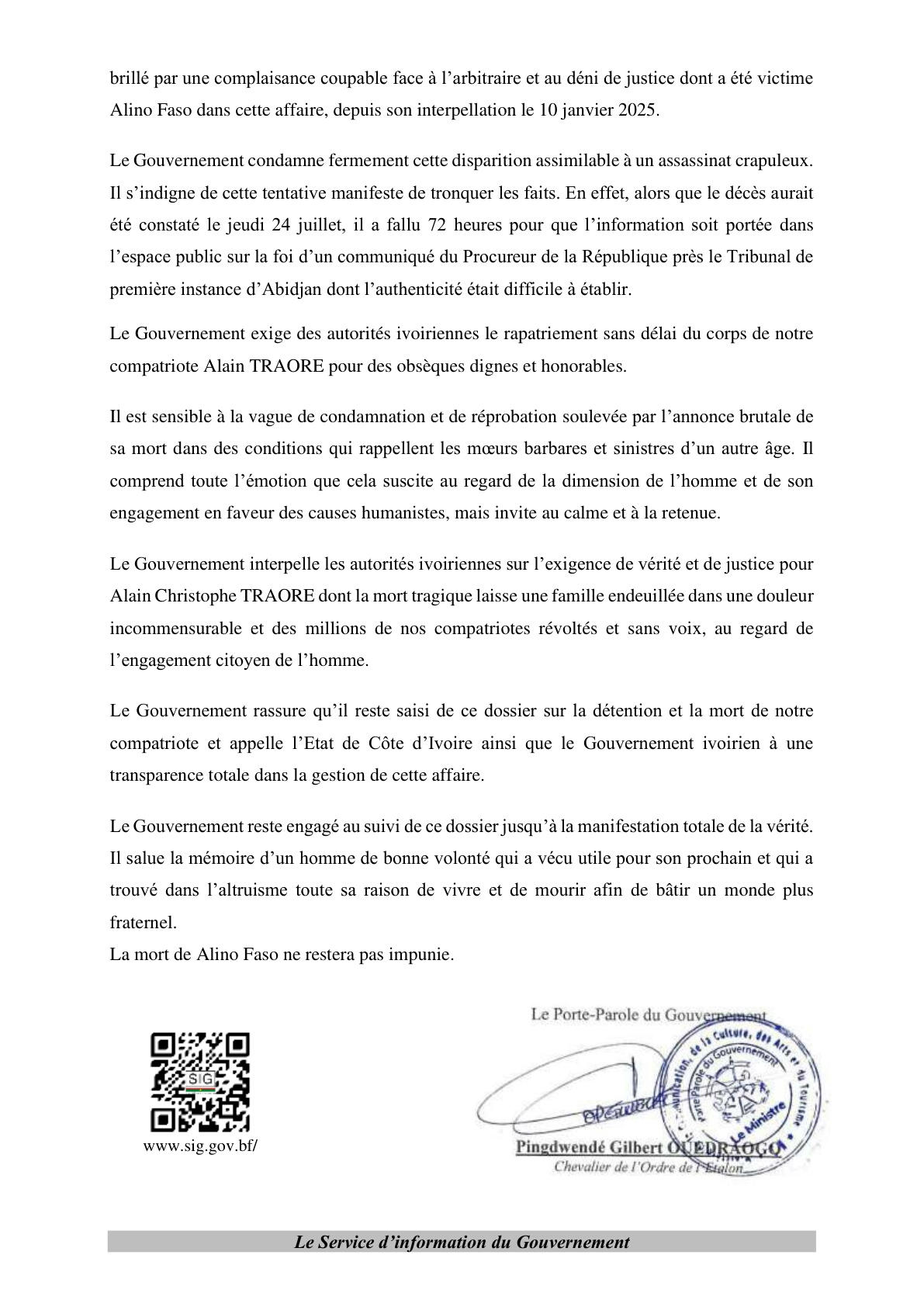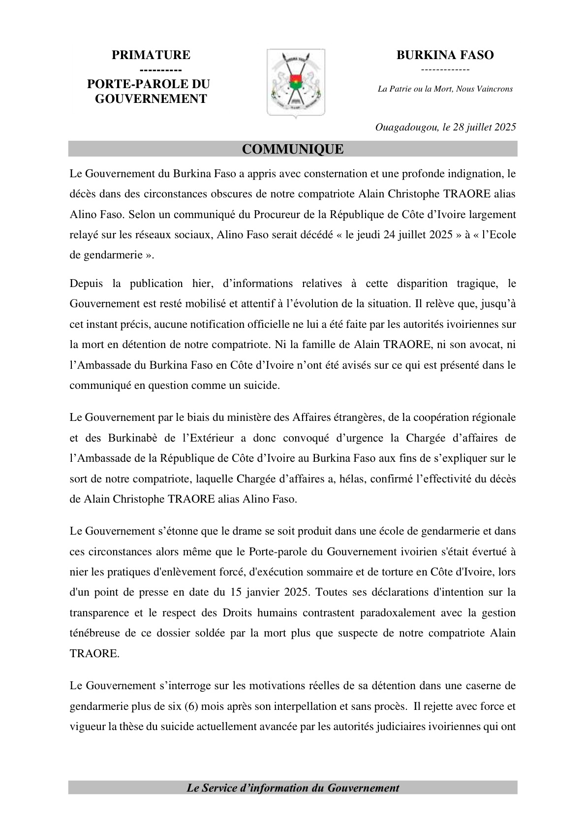 Actualité Annonces-Communiqués Officiel -Affaire mort tragique de Alino Faso: le communiqué du gouvernement Burkinabè Réveil info 28 juillet 2025 Continue Reading Previous Previous post: Reforestation 2025 : la région des Yaadsé répond à l’appel de IBNext Next post: Madou Dossama,ancien footballeur, président du comité d’organisation du Tournoi de la fraternité: » les supporters ont déserté les stades et cela a un impact sur le football,sur le contenu du jeu » Laisser un commentaire Annuler la réponseVotre adresse e-mail ne sera pas publiée. Les champs obligatoires sont indiqués avec *Commentaire * Nom * E-mail * Site web Enregistrer mon nom, mon e-mail et mon site dans le navigateur pour mon prochain commentaire. Articles connexes Contrat d’objectifs 2025: la famille d’abord !!! 2 février 2026 Évaluation Contrat d’objectifs2025 – justice : Edasso frappe fort. 2 février 2026