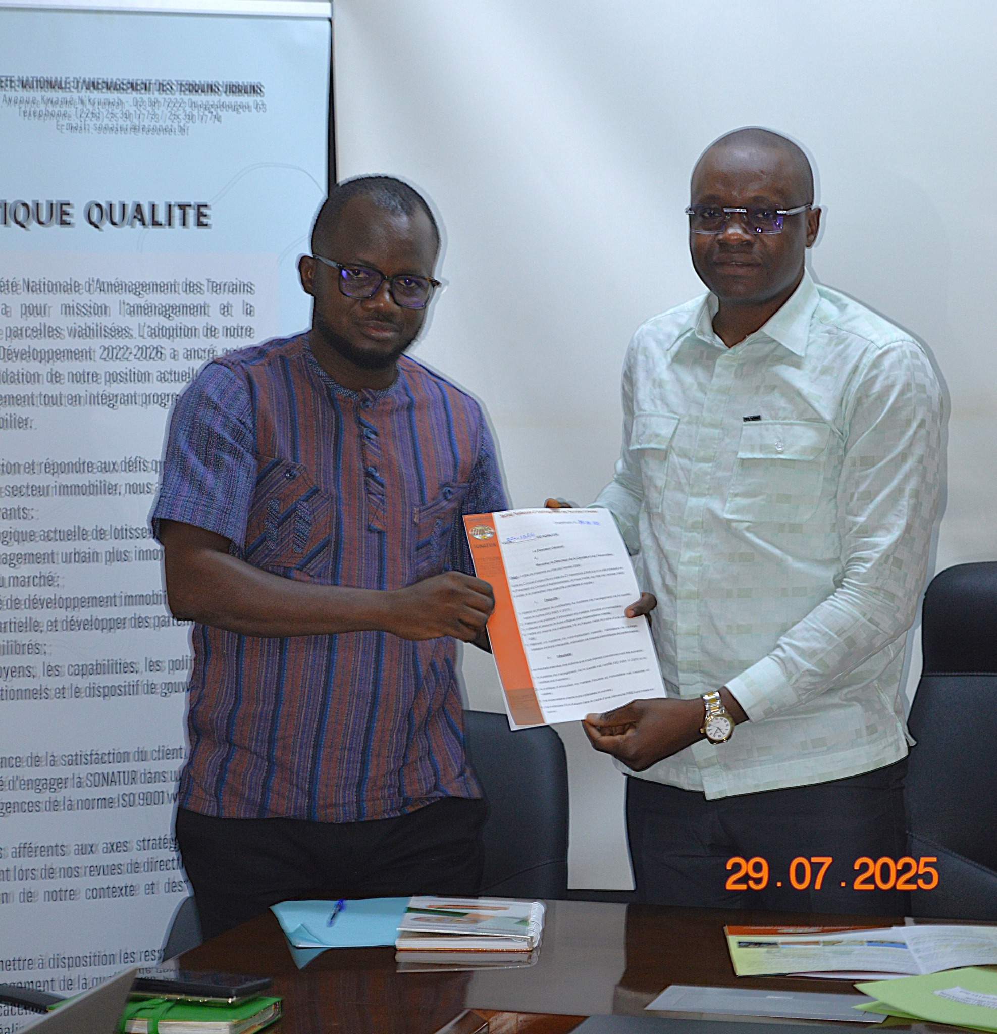 Le Directeur Général de la SONATUR, Monsieur Boureima OUATTARA, a procédé ce mardi 29 Juillet 2029 dans la salle de réunion de la Direction Générale, à l’installation officielle du nouveau Directeur de la Qualité et de l’innovation, Ibrahim SAVADOGO. L’installation du jour marque un tournant décisif vers la certification effective de la SONATUR au Système de mangement de la Qualité (SMQ) à la norme ISO 9001- version 2015.