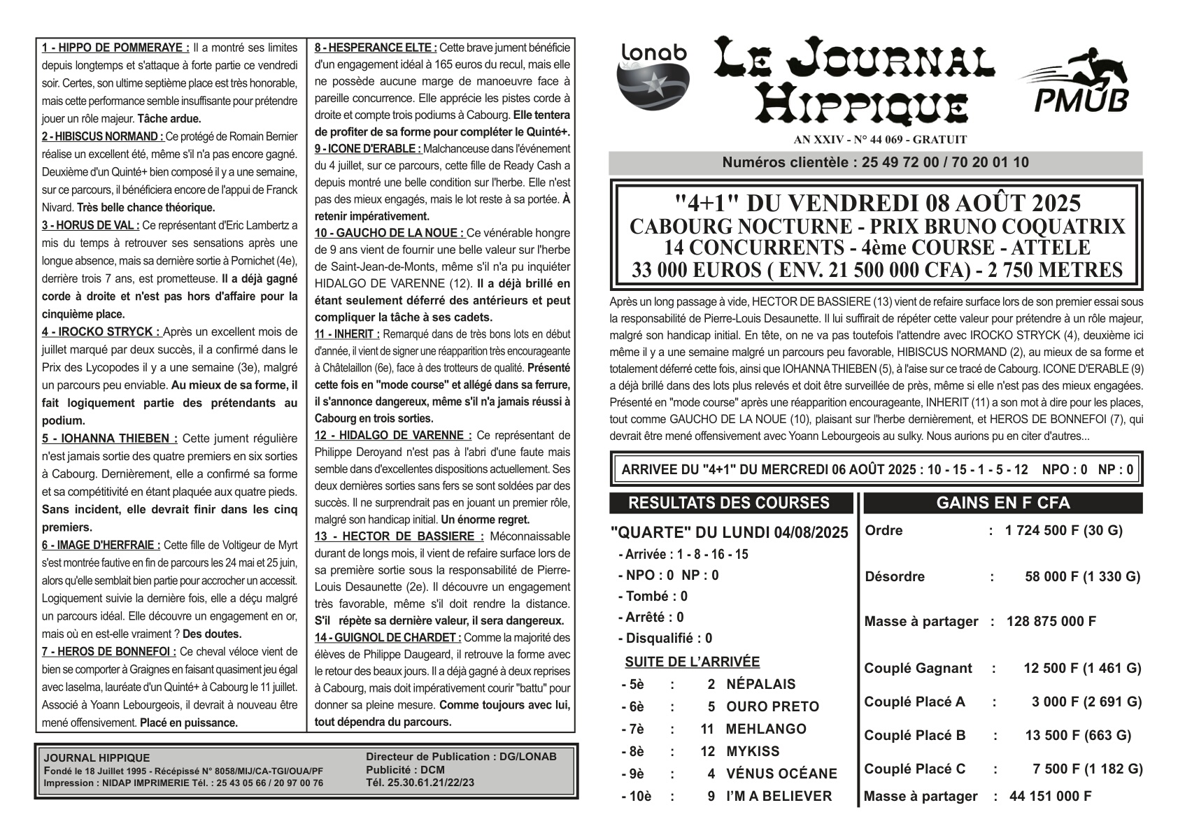 La page du PMUB PMUB: Quinté du 8 août 2025- programme et pronostics Réveil info 8 août 2025 Les 6 chevaux de Reveil-info: 4-9-2-13-3-10 Arret des jeux :18h05 Continue Reading Previous Previous post: Au palais de Justice: soutenu par son oncle,il le trahit pour 43 millionsNext Next post: Akon: « j’avais 30 voitures…l’homme change » Laisser un commentaire Annuler la réponseVotre adresse e-mail ne sera pas publiée. Les champs obligatoires sont indiqués avec *Commentaire * Nom * E-mail * Site web Enregistrer mon nom, mon e-mail et mon site dans le navigateur pour mon prochain commentaire. Articles connexes PMUB: programme et pronostics du mercredi 20 août – Quinté 4+1 19 août 2025 PMUB: résultat et gains de ce 19 Août 19 août 2025