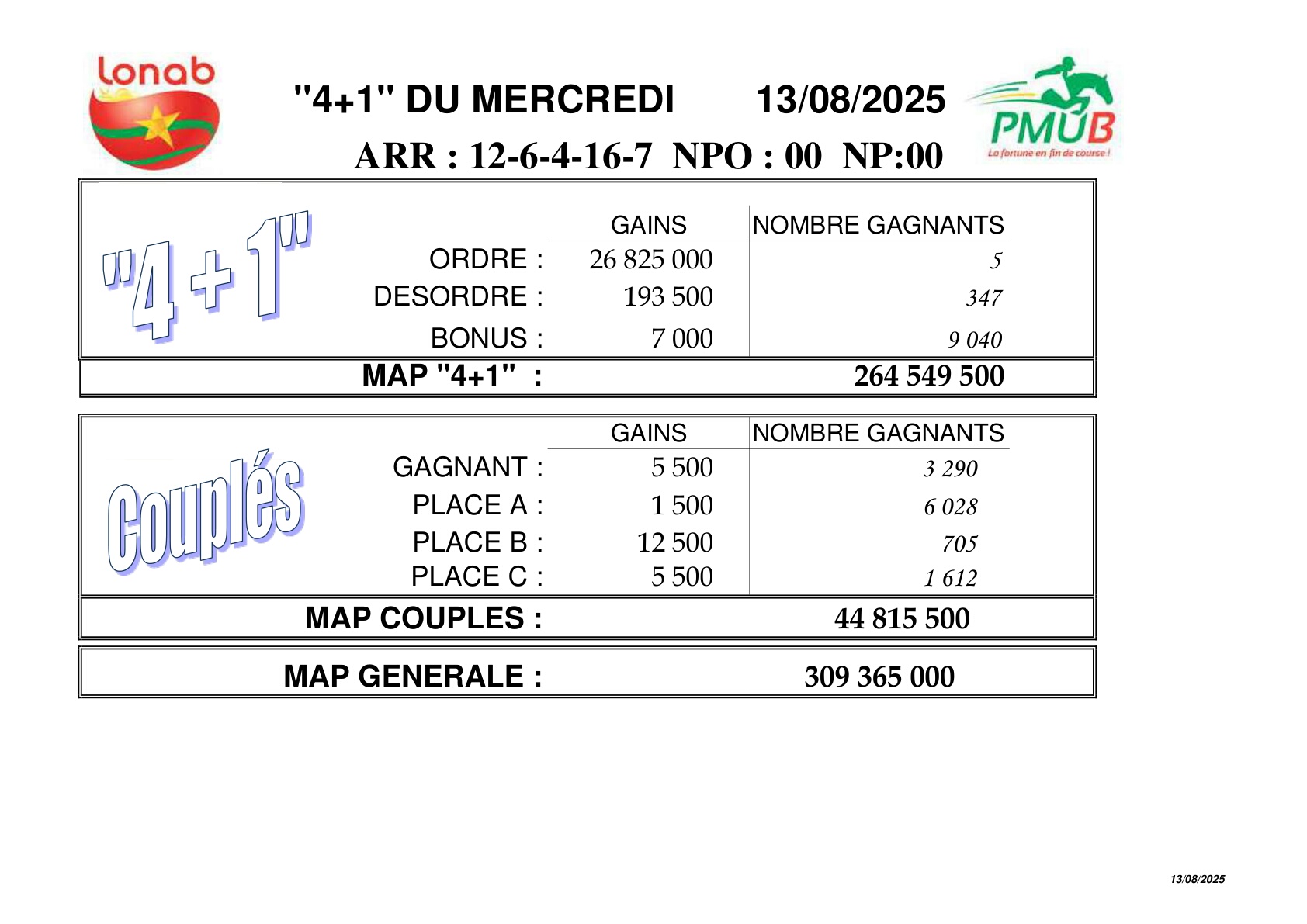 La page du PMUB PMUB: resultat et gains de ce 13 août Réveil info 13 août 2025 Continue Reading Previous Previous post: CHR de Dédougou : Une équipe médicale extrait un kyste ovarien de 14 kg chez une patiente de 26 ansNext Next post: Urgent – Électricité : la SONABEL communique…. Laisser un commentaire Annuler la réponseVotre adresse e-mail ne sera pas publiée. Les champs obligatoires sont indiqués avec *Commentaire * Nom * E-mail * Site web Enregistrer mon nom, mon e-mail et mon site dans le navigateur pour mon prochain commentaire. Articles connexes PMUB: programme et pronostics du mercredi 20 août – Quinté 4+1 19 août 2025 PMUB: résultat et gains de ce 19 Août 19 août 2025