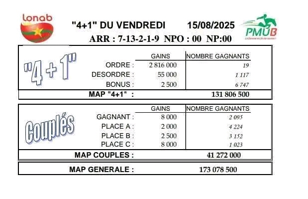 La page du PMUB PMUB: résultat et gains du quinté de ce vendredi 15 août Réveil info 15 août 2025 Continue Reading Previous Previous post: Place de la Bataille des Rails: un symbole de résistance au coeur de la capitaleNext Next post: Alerte- Recrutement de personnel à « Faso Mêbo » : attention à l’anarque en ligne Laisser un commentaire Annuler la réponseVotre adresse e-mail ne sera pas publiée. Les champs obligatoires sont indiqués avec *Commentaire * Nom * E-mail * Site web Enregistrer mon nom, mon e-mail et mon site dans le navigateur pour mon prochain commentaire. Articles connexes PMUB: programme et pronostics du mercredi 20 août – Quinté 4+1 19 août 2025 PMUB: résultat et gains de ce 19 Août 19 août 2025