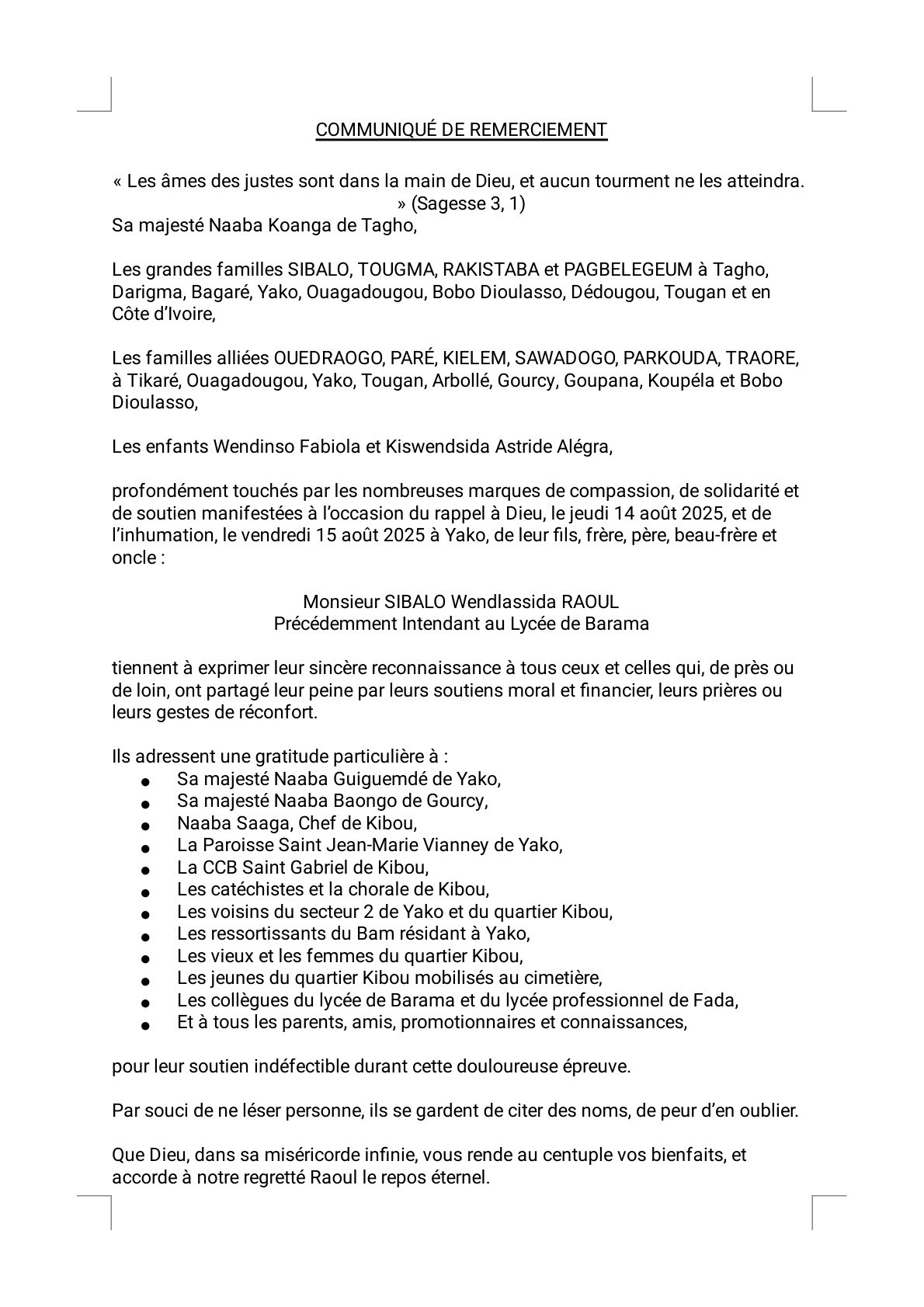 Annonces-Communiqués Nécrologie : communiqué de remerciements Réveil info 26 août 2025 Continue Reading Previous Previous post: Initiative Faso Mêbo: « voisins solidaires de Bargo » mise 6 tonnes de cimentNext Next post: Chantiers du centre médical de Pô et de l’amphithéâtre de Manga : le capitaine Anderson Médah repars sur le terrain Laisser un commentaire Annuler la réponseVotre adresse e-mail ne sera pas publiée. Les champs obligatoires sont indiqués avec *Commentaire * Nom * E-mail * Site web Enregistrer mon nom, mon e-mail et mon site dans le navigateur pour mon prochain commentaire. Articles connexes FASO MEBO- Bilan contributions par région : plus de 45 millions pour le Kadiogo 1 février 2026 Dissolution des partis politiques : Réaction de l’ex -CDP 31 janvier 2026
