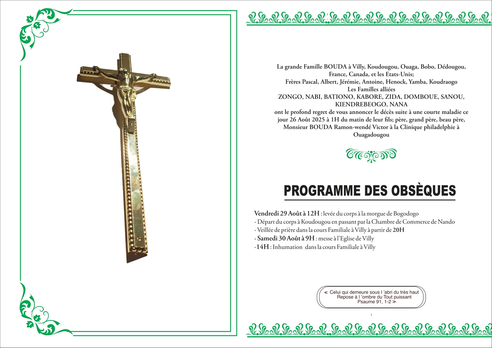 Actualité Nécrologie : programme des obsèques de Victor Bouda « CORAM » Réveil info 28 août 2025 Continue Reading Previous Previous post: Etalons: la liste des joueurs convoquésNext Next post: Prix des motos,frais de scolarité, denrée alimentaire…: Déclaration de la Ligue des consommateurs Laisser un commentaire Annuler la réponseVotre adresse e-mail ne sera pas publiée. Les champs obligatoires sont indiqués avec *Commentaire * Nom * E-mail * Site web Enregistrer mon nom, mon e-mail et mon site dans le navigateur pour mon prochain commentaire. Articles connexes Affaire du Ciment : le ministre Poda rencontre les cimentiers 18 mars 2026 Dialogue social : le ministre Traoré met fin à un litige vieux de 24 ans entre SITARAIL et ses travailleurs 18 mars 2026