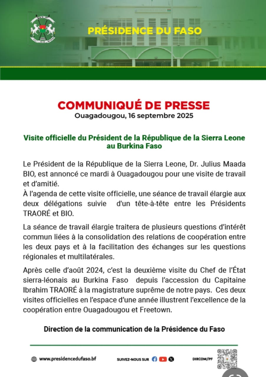Actualité Annonces-Communiqués Burkina : le président de la Sierra Leone à Ouagadougou ( le communiqué) Réveil info 16 septembre 2025 Continue Reading Previous Previous post: Plainte du Mali contre l’Algérie : Alger dément toute saisine de la CIJNext Next post: Suède :Une ministre s’effondre en pleine conférence de presse Laisser un commentaire Annuler la réponseVotre adresse e-mail ne sera pas publiée. Les champs obligatoires sont indiqués avec *Commentaire * Nom * E-mail * Site web Enregistrer mon nom, mon e-mail et mon site dans le navigateur pour mon prochain commentaire. Articles connexes CAF: une pétition internationale pour sa dissolution 21 mars 2026 CAN Maroc -décision de la CAF: une décision juridiquement indéfendable 21 mars 2026