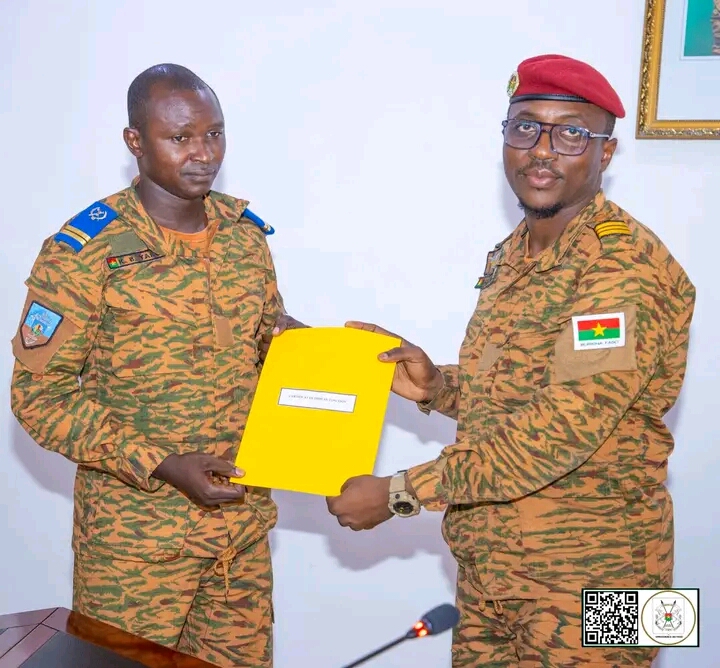 (Ouagadougou, le 23 septembre 2025). Le Ministre Directeur de Cabinet du Président du Faso, le Capitaine Martha Céleste Anderson Dékomwin MEDAH, a présidé, hier lundi, la cérémonie de passation de service entre l’Intendant entrant de la Présidence du Faso, le Lieutenant Korê Bernard YARO et celui sortant le Capitaine Phillipe SOMDA.
