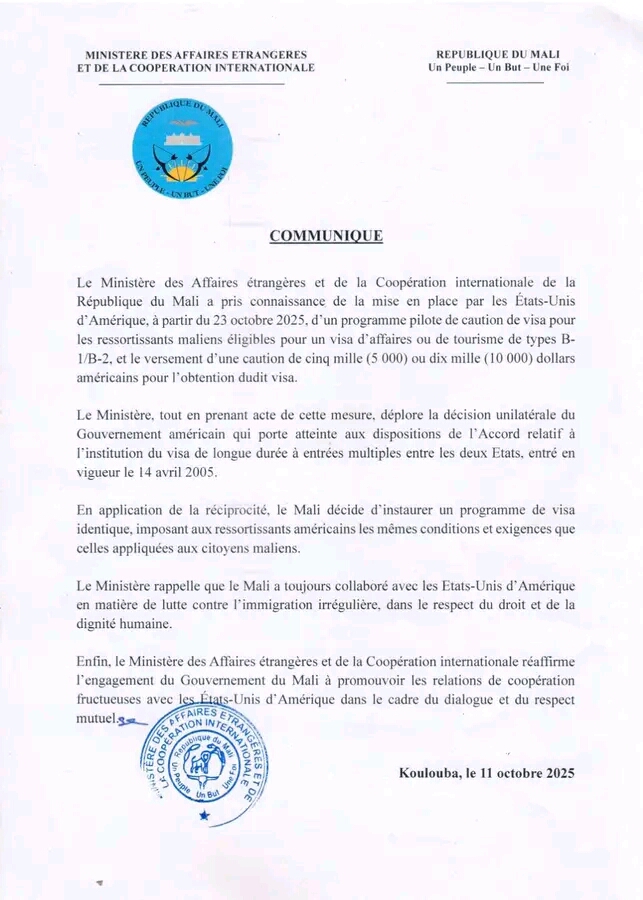 Communiqué par lequel le Ministère des Affaires étrangères et de la Coopération internationale informe de la décision de la République du Mali d’appliquer la réciprocité en réaction à la mise en place par les États-Unis d’Amérique d’un programme pilote de caution de visa pour les ressortissants maliens.