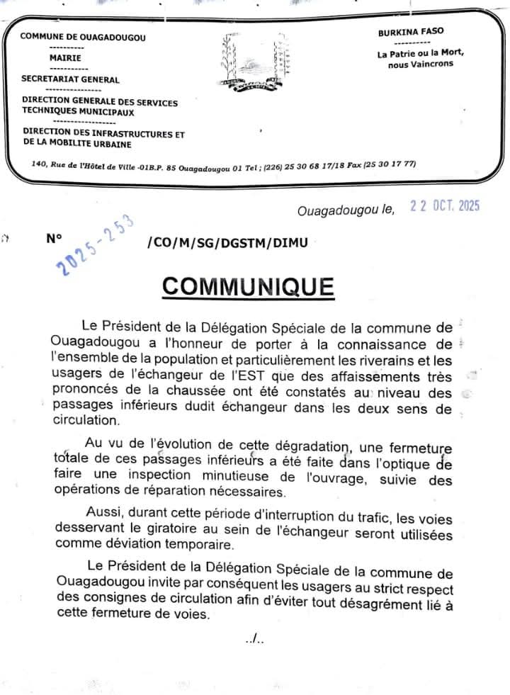Actualité Ouagadougou : l’échangeur de l’Est fermé pour travaux ( le communiqué) Réveil info 23 octobre 2025 Continue Reading Previous Previous post: Ouagadougou : les taxis dans le viseur de la police municipaleNext Next post: Conseil des ministres : obligations des propriétaires d’établissements à construire des parkings Laisser un commentaire Annuler la réponseVotre adresse e-mail ne sera pas publiée. Les champs obligatoires sont indiqués avec *Commentaire * Nom * E-mail * Site web Enregistrer mon nom, mon e-mail et mon site dans le navigateur pour mon prochain commentaire. Articles connexes Grand prix cycliste RTB: la RTB chez le Mogho Naaba 3 février 2026 Ghana : le Co-fondateur de Ecobank et la compagnie aérienne Asky honoré 3 février 2026