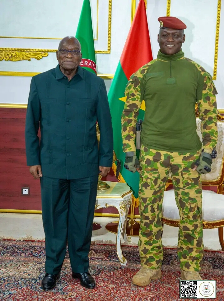 (Ouagadougou, le 3 novembre 2025). Le Président du Faso, Chef de l’État, le Capitaine Ibrahim TRAORÉ, a accordé une audience, ce lundi au palais de Koulouba, à l’ancien Président sud-africain Jacob ZUMA. Accompagné par le Ministre burkinabè des Affaires étrangères, Karamoko Jean Marie TRAORÉ, l’ancien compagnon de lutte de Nelson MANDELA dit être venu parler de la libération du continent africain.