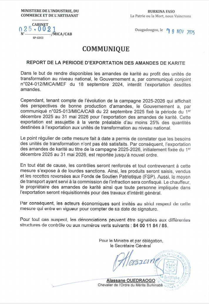 Annonces-Communiqués COMMUNIQUÉ PORTANT REPORT DE LA PÉRIODE D’EXPORTATION DES AMANDES DE KARITÉ. Réveil info 20 novembre 2025 Continue Reading Previous Previous post: Au palais de Justice: L’avocate Benjamine Esther Ini Doli condamnée à un an de prison fermeNext Next post: Conseil des ministres : Nationalisation de la SN-CITEC,fusion CIL et CSC… Laisser un commentaire Annuler la réponseVotre adresse e-mail ne sera pas publiée. Les champs obligatoires sont indiqués avec *Commentaire * Nom * E-mail * Site web Enregistrer mon nom, mon e-mail et mon site dans le navigateur pour mon prochain commentaire. Articles connexes FASO MEBO- Bilan contributions par région : plus de 45 millions pour le Kadiogo 1 février 2026 Dissolution des partis politiques : Réaction de l’ex -CDP 31 janvier 2026