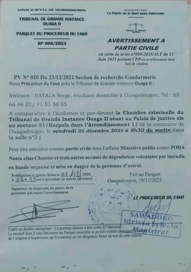 Le procès prévu le vendredi 5 décembre 2025 au Tribunal de grande instance Ouaga 2.