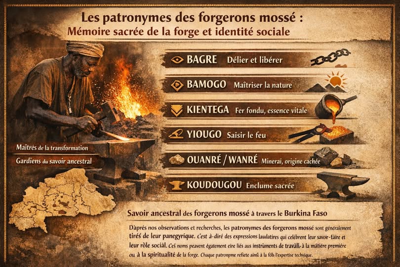 Les patronymes tels que Bagre et Bamogo traduisent la dimension cosmologique de la forge. Ils renvoient à la capacité du forgeron à délier, résoudre et dompter les forces de la nature, tout en restant soumis à la loi suprême de l’univers. Les noms Kientega, Yiougo, Ouanré/Wanré et Koudougou rappellent quant à eux que chaque étape du travail du fer du minerai enfoui dans la terre à la mise en forme sur l’enclume est un acte chargé de sacralité.