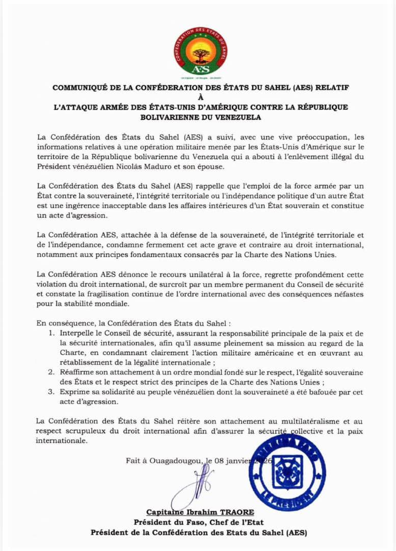 Dans un communiqué officiel signé ce jour 8 Janvier 2026 par le Président Ibrahim Traoré, l’AES condamne fermement, l’agression militaire des États-Unis contre le Vénézuéla, ayant abouti à l’enlèvement illégal du Président Nicolás Maduro et de son épouse.
