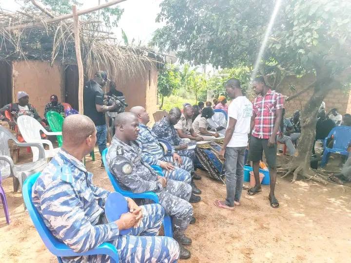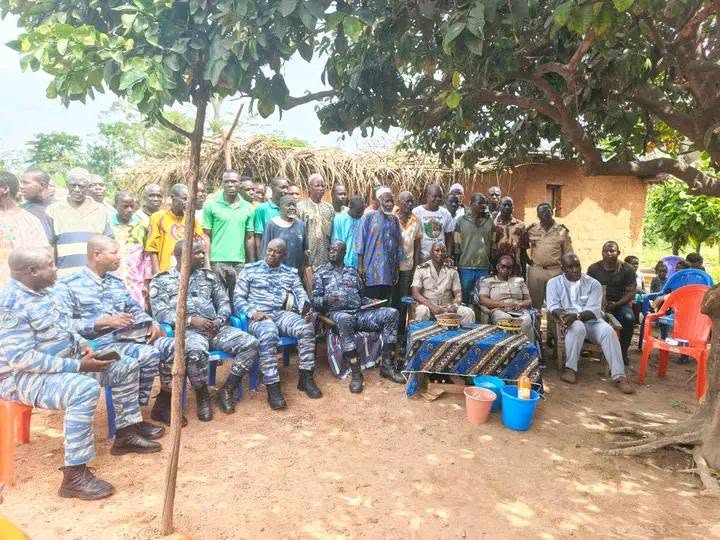 Accompagné du sous-préfet de Guiglo, Nathalie Marthe Ossiri, épouse Gbadji, et d’éléments des unités des forces de défense et de sécurité (FDS), gendarmerie et police, du chef du village de Goya 1, et du président des jeunes, M. N’Guessan est arrivé dans le campement, afin de contribuer à faire en sorte que les membres des deux communautés fument le calumet de la paix.
