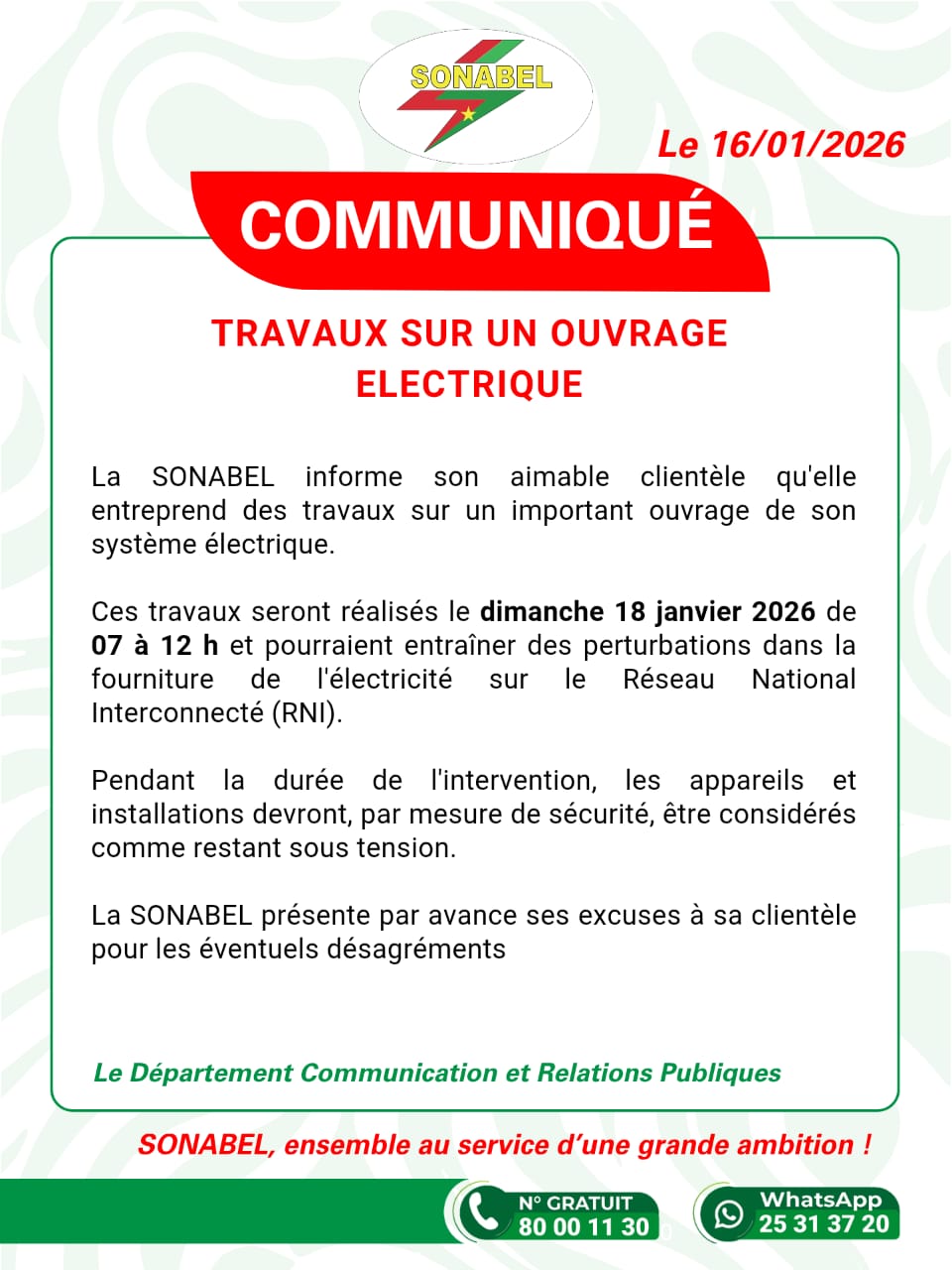 Annonces-Communiqués URGENT-Communiqué SONABEL Réveil info 17 janvier 2026 Continue Reading Previous Previous post: Bobo-Dioulasso : drame à ColmaNext Next post: Production agricole : le ministre Sombié à l’offensive Laisser un commentaire Annuler la réponseVotre adresse e-mail ne sera pas publiée. Les champs obligatoires sont indiqués avec *Commentaire * Nom * E-mail * Site web Enregistrer mon nom, mon e-mail et mon site dans le navigateur pour mon prochain commentaire. Articles connexes Ramadan : Communiqué FAIB 19 mars 2026 Les grands dossiers du Conseil des ministres de ce jeudi 19 mars 2026 19 mars 2026