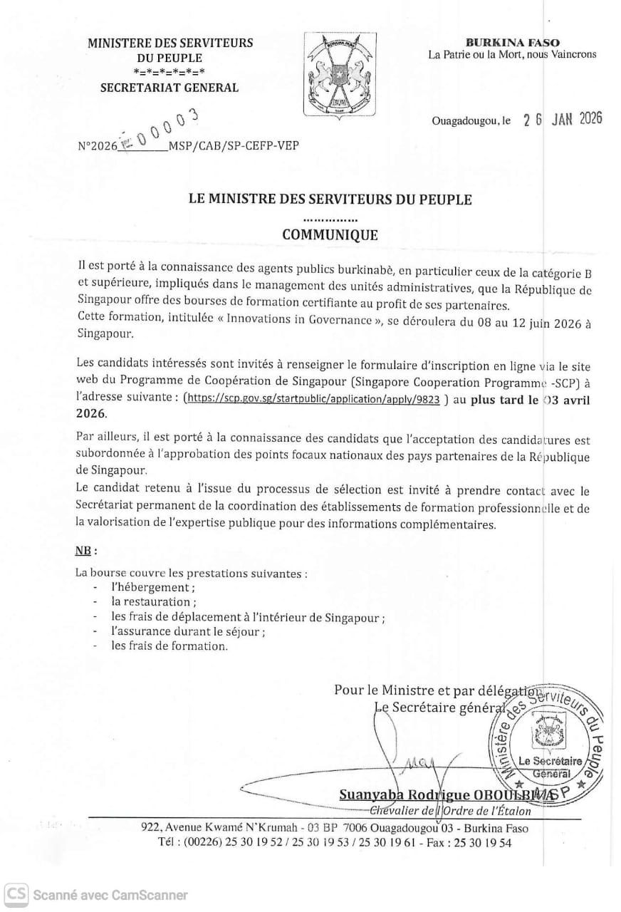 Il est porté à la connaissance des agents publics burkinabè, en particulier ceux de la catégorie B et supérieure, impliqués dans le management des unités administratives, que la République de Singapour offre des bourses de formation certifiante au profit de ses partenaires.