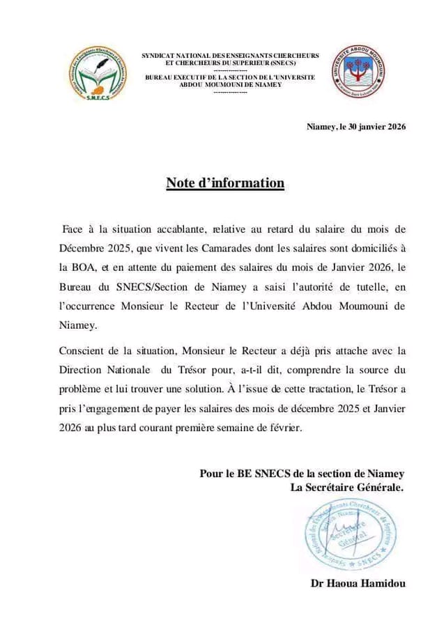 Le Bureau du SNECS/Section de Niamey a saisi le Recteur de l’Université Abdou Moumouni de Niamey concernant le retard des salaires de décembre 2025 et l’attente des salaires de janvier 2026 pour les Camarades domiciliés à la BOA. Le Recteur a contacté la Direction Nationale du Trésor pour comprendre et résoudre le problème. Le Trésor s’est engagé à payer les salaires au plus tard courant première semaine de février.